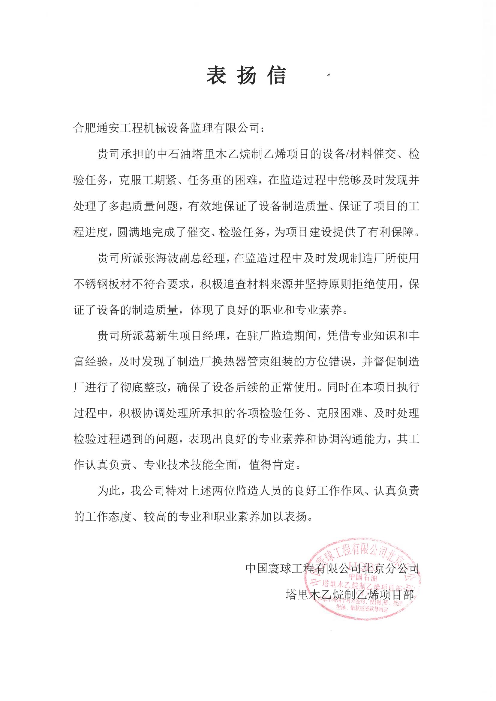 中國寰球塔里木乙烷制乙烯項目表揚信